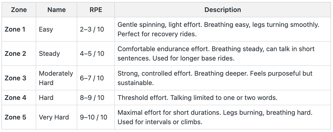 If you train by feel (RPE), use the table below to guide your effort levels for each zone.