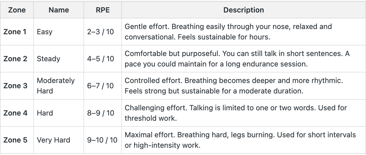 If you train by feel (RPE), use the RPE table below to guide your effort levels for each zone.